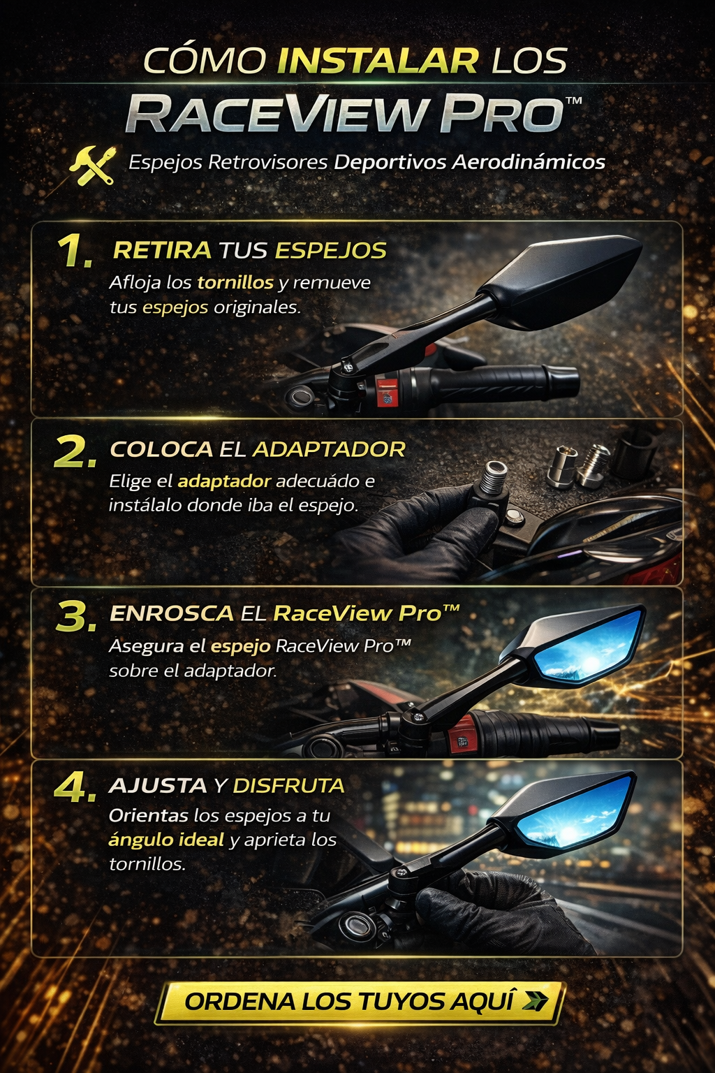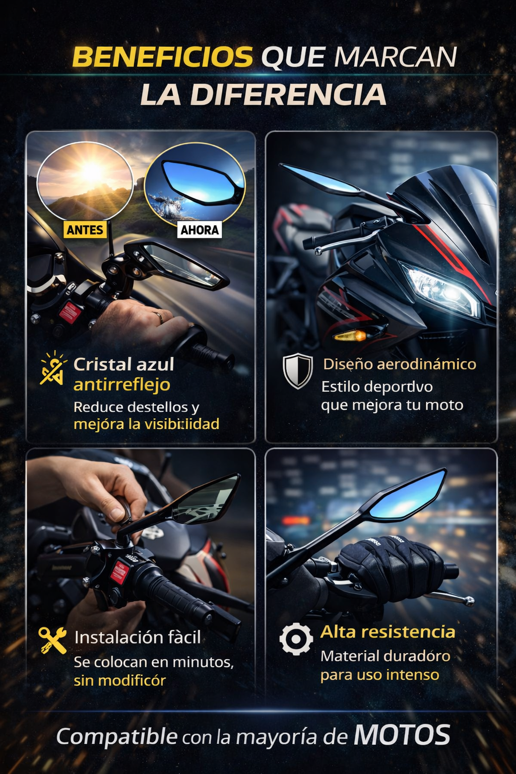 Sí. Son universales, compatibles con la mayoría de motocicletas, scooters y motos deportivas que usan fijación estándar. Incluyen tornillos y adaptadores.