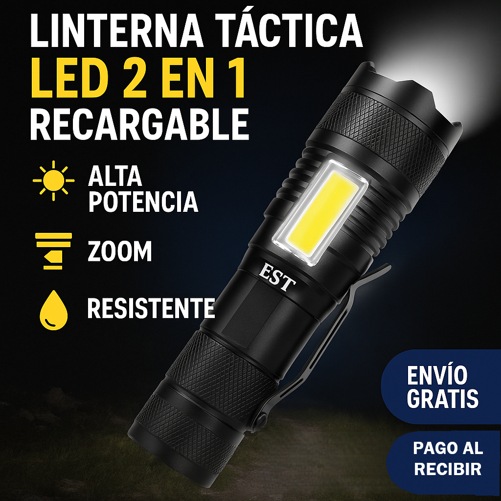 La Linterna Táctica LED 2 en 1 es la solución para tener iluminación potente, confiable y lista para cualquier situación.