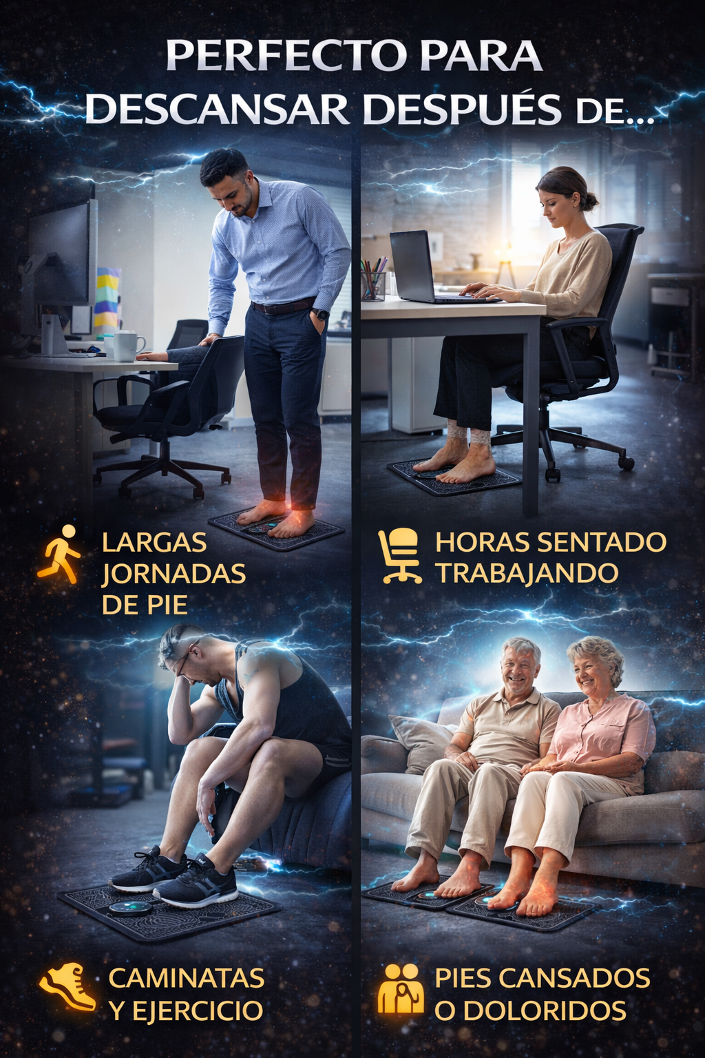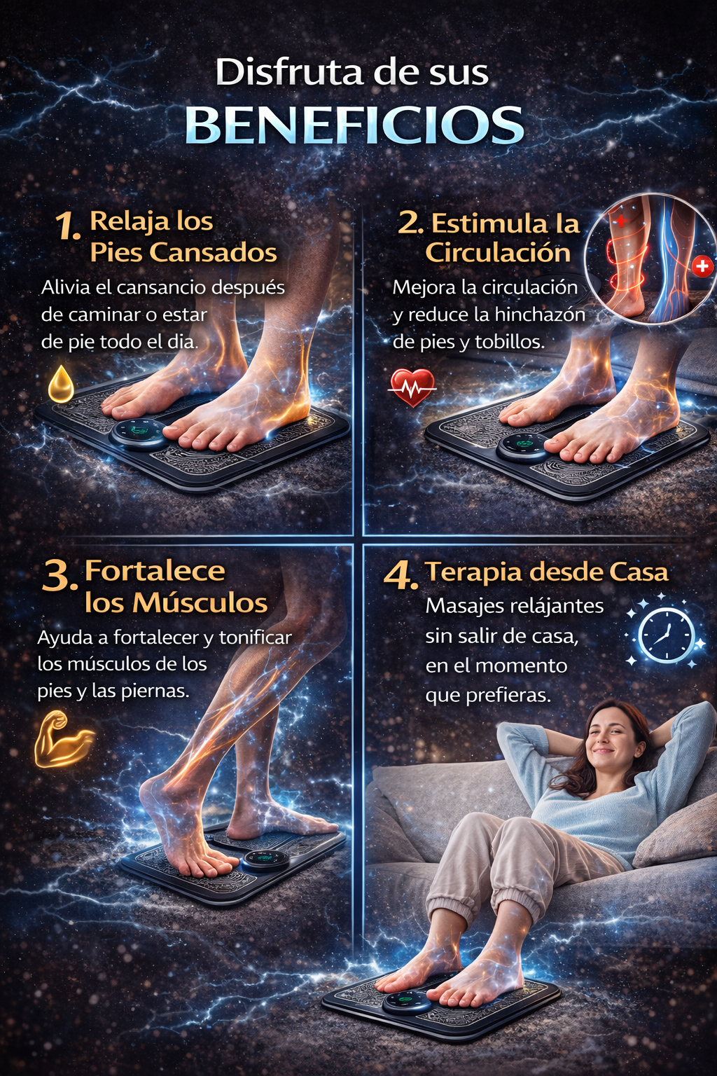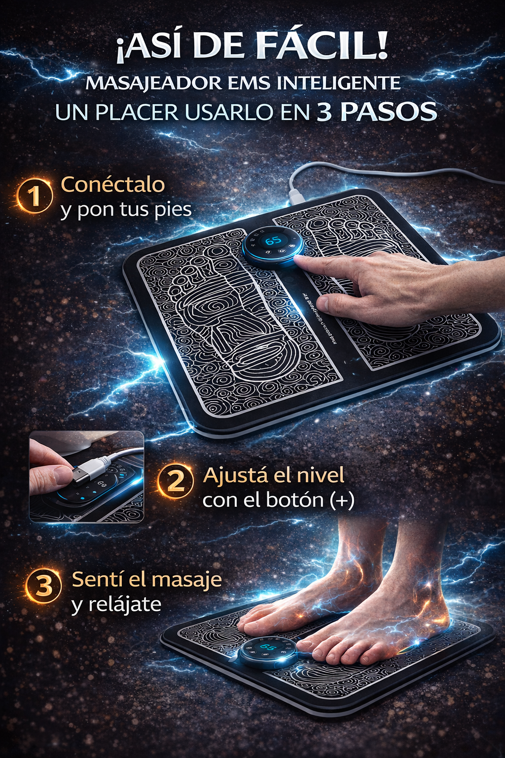 Sirve para ayudar a relajar los pies cansados y brindar una sensación de alivio y descanso mediante impulsos eléctricos suaves (EMS).
